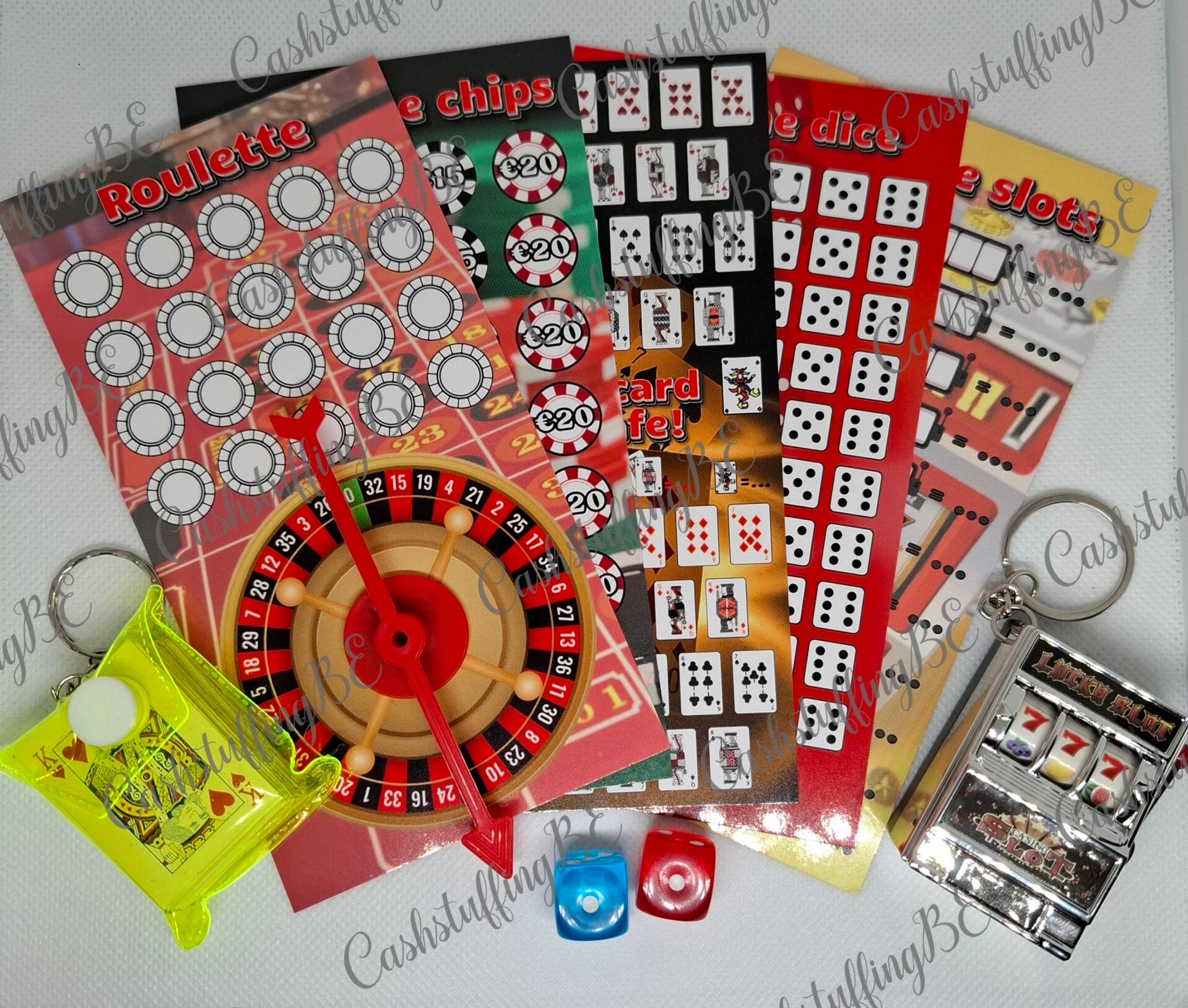 Deze set bevat ook het kaartspel met kleur naar keuze, de fruitmachine en één 6-zijdige dobbelsteen.
